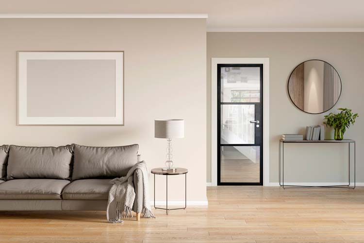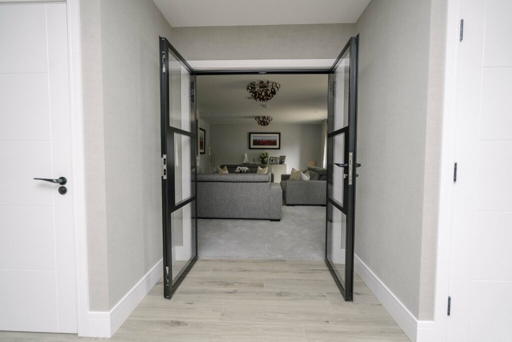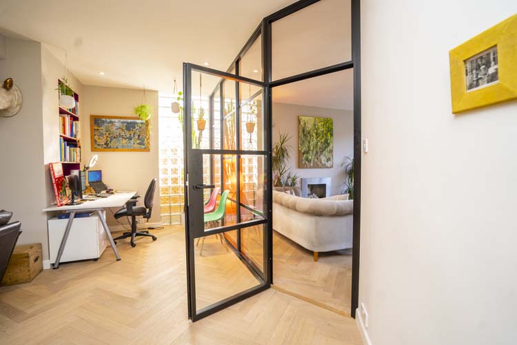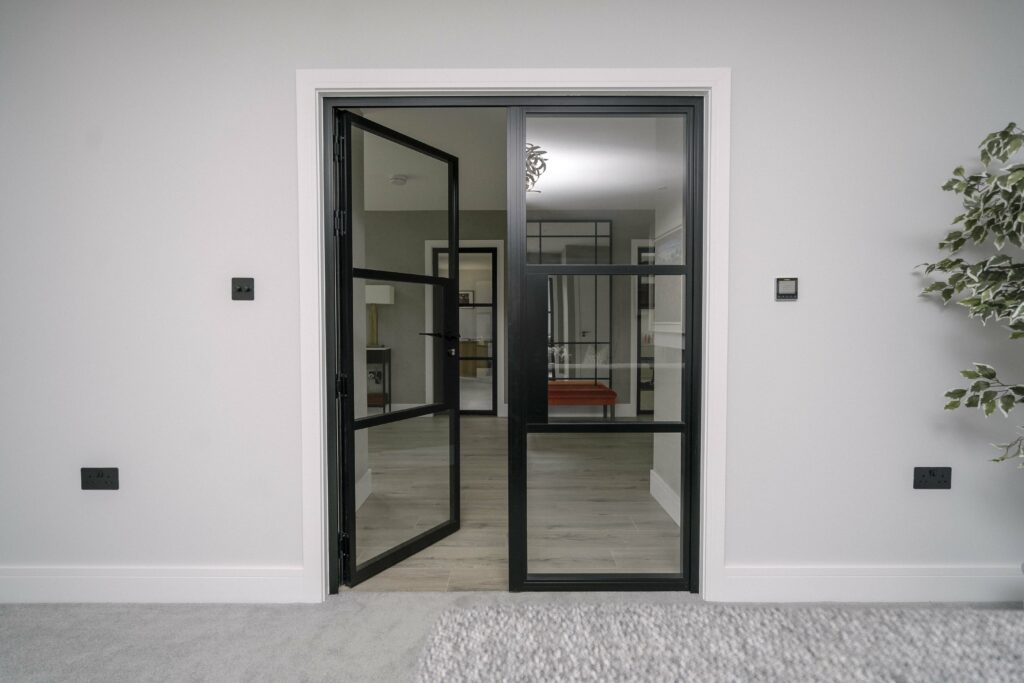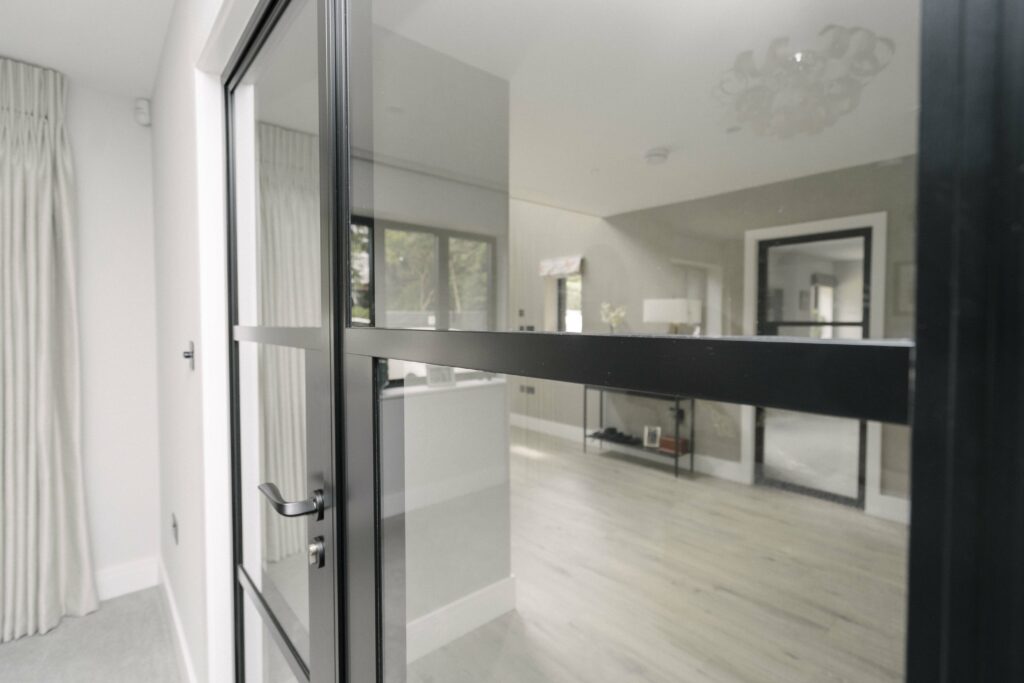 All internal doors have no bottom frame creating a seamless flow between rooms and feature authentic design details like the slim horizontal and vertical glazing bars, handle backplate, and bottom kick plate as well as a bespoke floating lock.