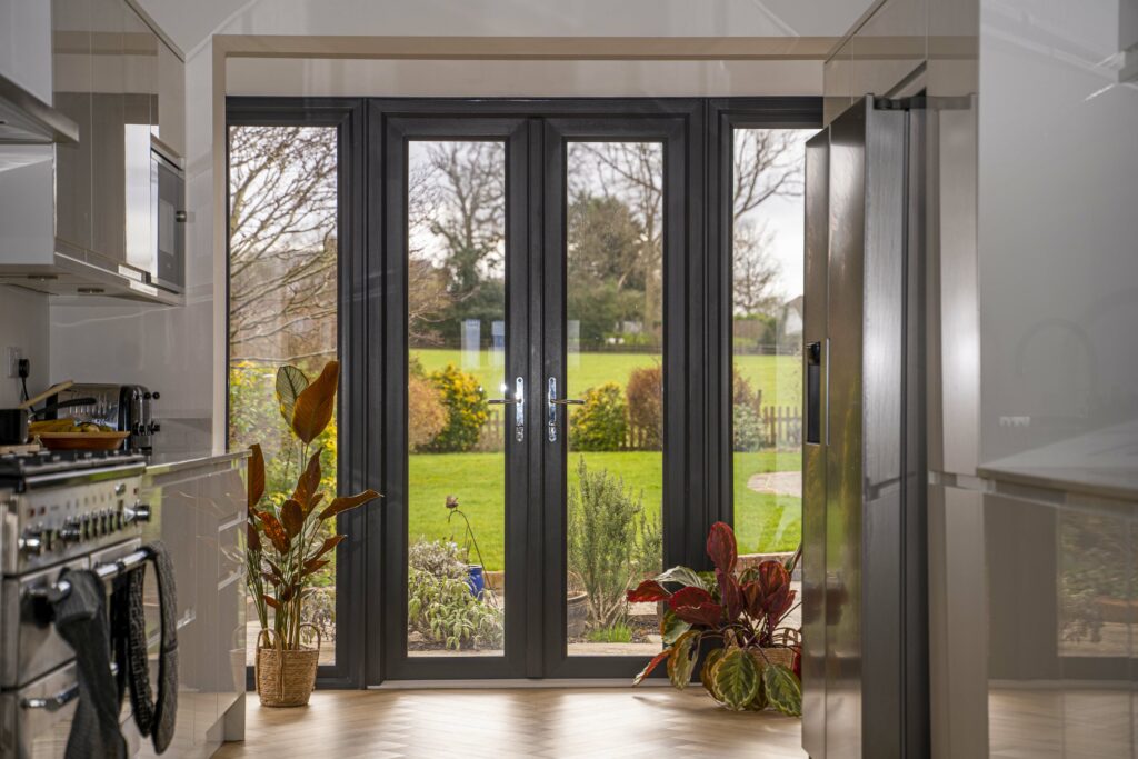 Dark Grey French Doors and Sidelights replace Wooden Box Bay Windows in Kitchen, Finchampstead.