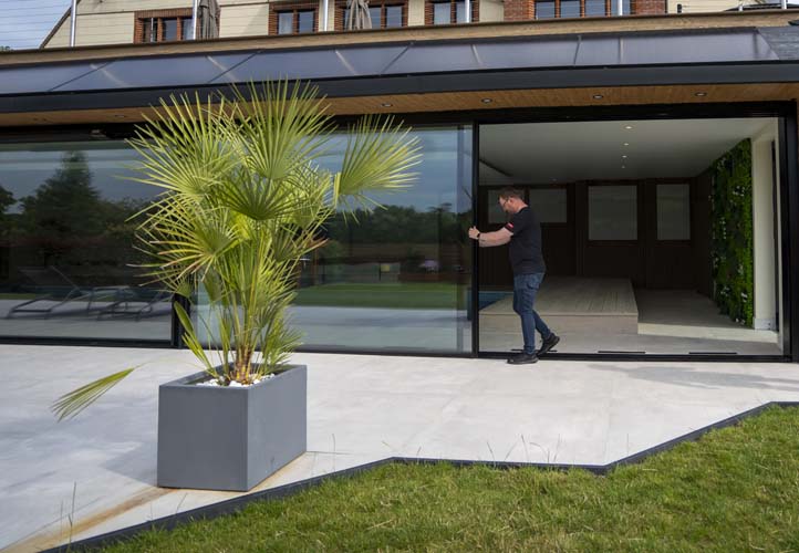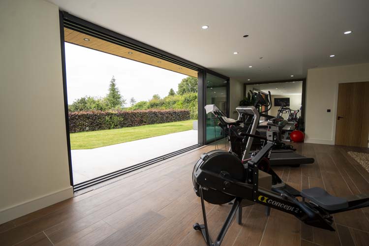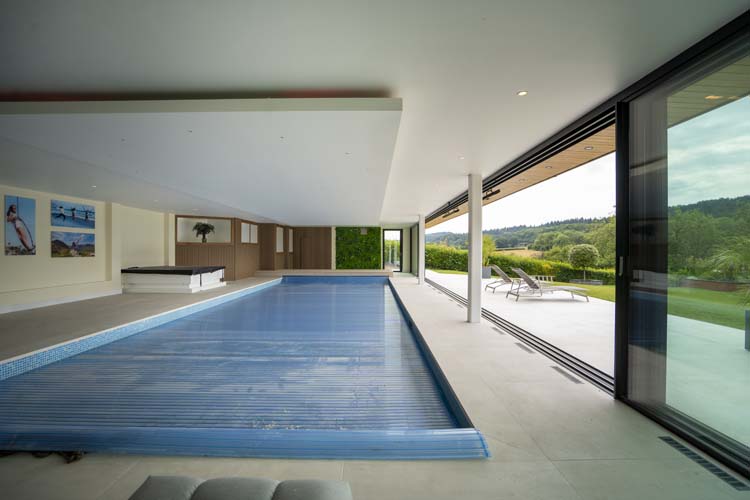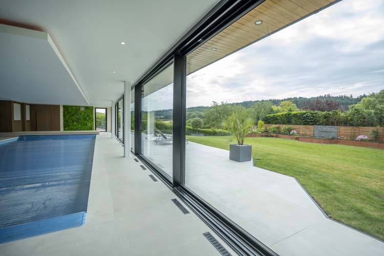 With its unique design and exceptional performance, the six-pane, 20-metre wide Solarlux Cero III minimalist sliding door adds a grand statement to the swimming pool and gym extension at an exceptional arts and crafts property in Guildford. It offers breathtaking views of the open Surrey countryside.