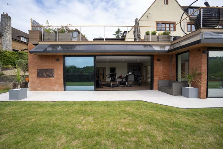 The six-pane, triple-track, 20-metre-wide Solarlux Cero III minimalist sliding doors are under an impressive raised terrace. They add a spectacular contemporary focal point to the gym and swimming pool extension. They blend with the arts and crafts original architectural features, such as the distinctive triple-gabled roof and an owl box set into the central chimney, ensuring a cohesive aesthetic.