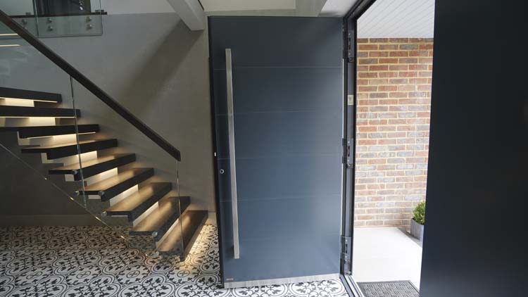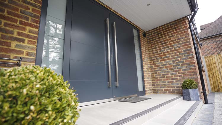 The horizontal lines and larger panels of these doors beautifully enhance the Weybridge detached property’s aesthetics, adding to the feeling of depth and space outside the entrance.