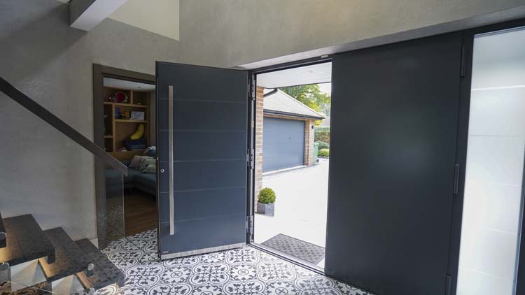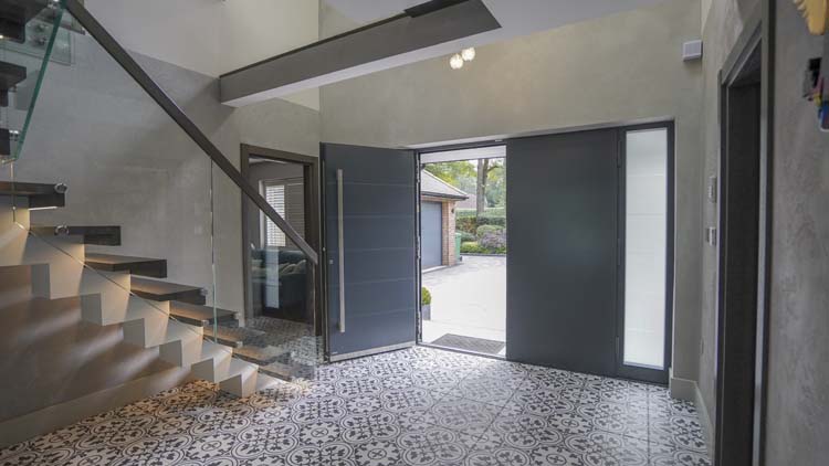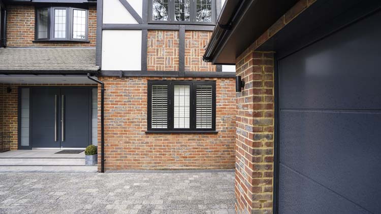 The end result is stunning; the anthracite grey colour works seamlessly within the property and internal double doors and creates an eye-catching contrast to the brickwork and works well with the garage door and with light grey tiles and paving at the entrance.
