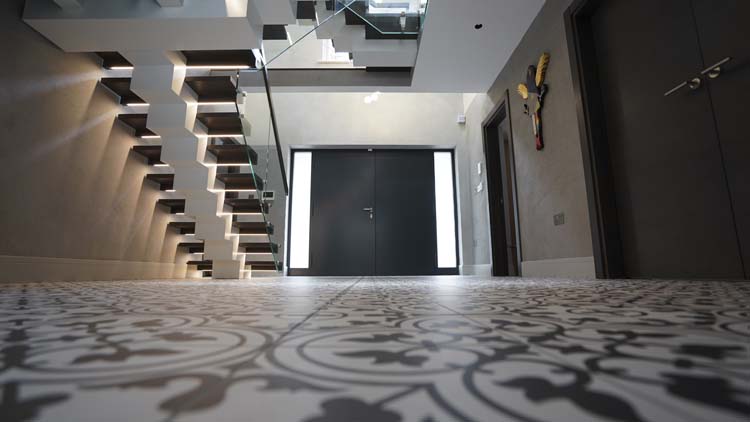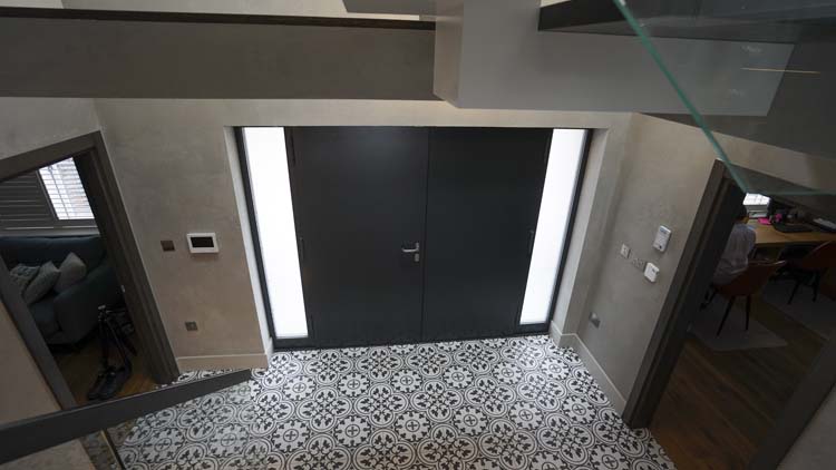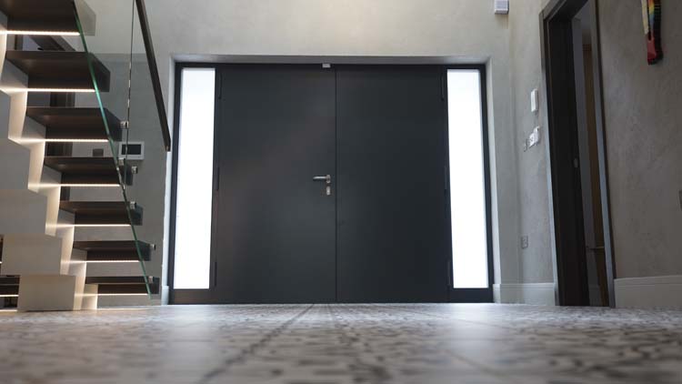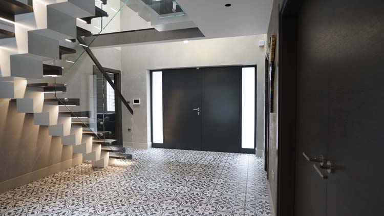 The aluminium doors were chosen in powder-coated anthracite grey RAL7016 finish on the exterior and interior to enhance the house’s whole aesthetics and add a sense of grandeur to the entrance.