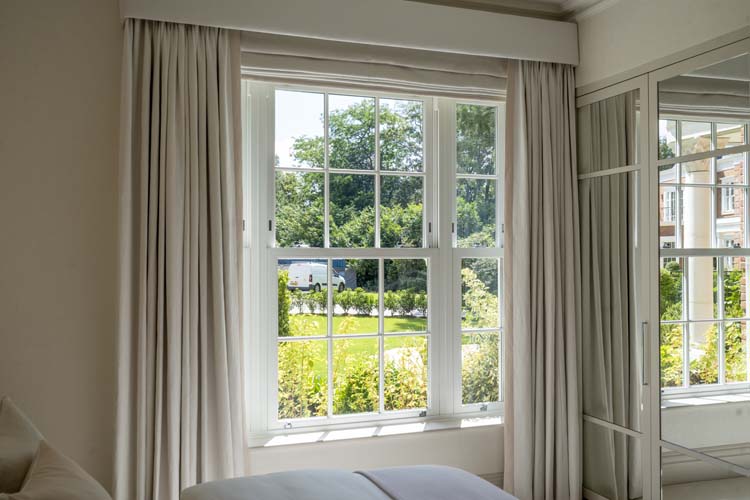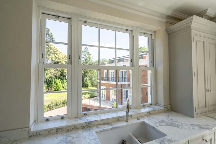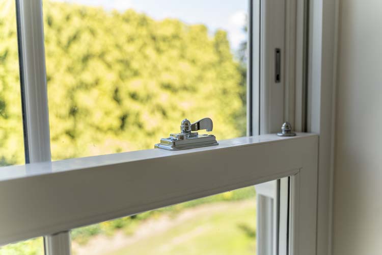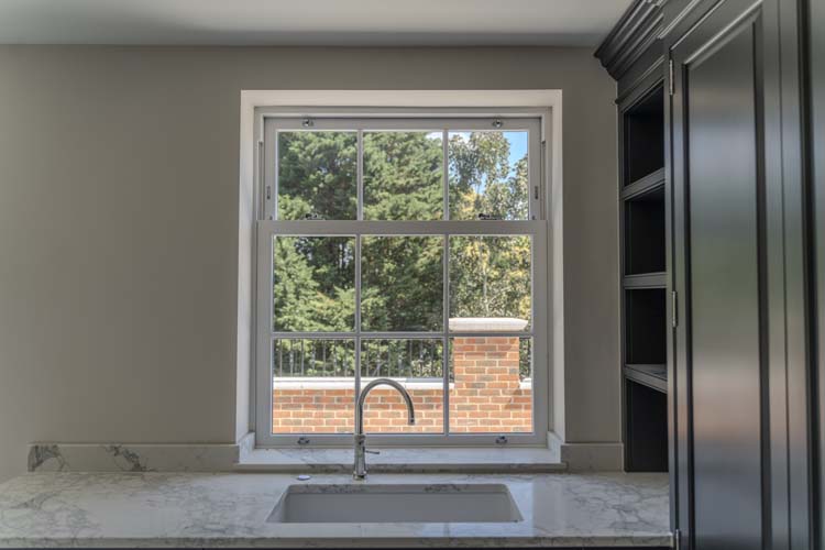 All the sliding sash windows are designed with the classic glazing pattern of early 18th-century Georgian windows, featuring six panes over six panes and elegant glazing bars finished in smooth white. They also incorporate traditional chrome sash lifts and ring pulls, adding a timeless, authentic period touch to the interior.