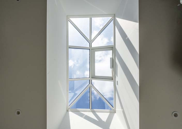 Four white aluminium roof lanterns create a dynamic architectural feature, illuminating the interiors with an abundance of natural light.