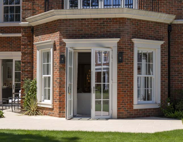 The crisp white lines of the windows and doors create a refined aesthetic that complements the period character of the Georgian-style manor houses, offering exceptional standards of design and innovation that are the hallmark of Thames Valley Windows.