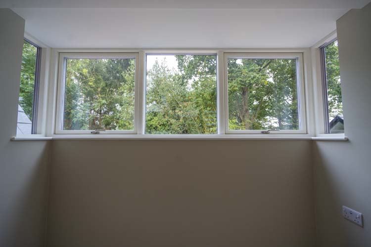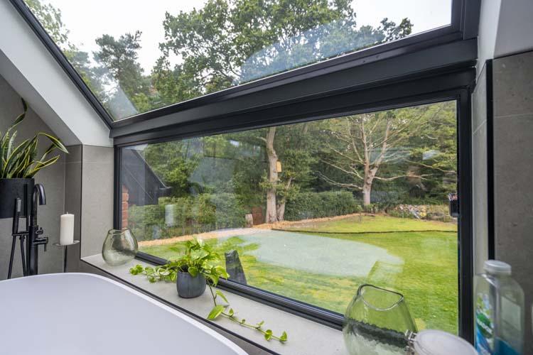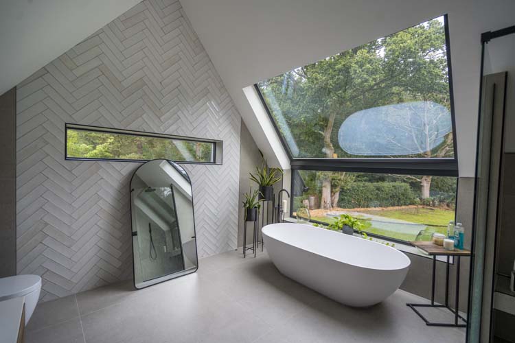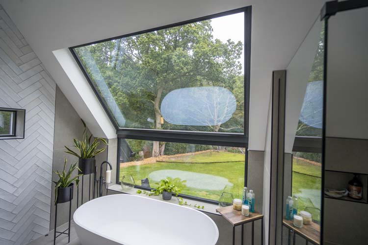 The impressive bathroom window is a stunning architectural feature when viewed from the outside and inside the property. It provides picturesque garden views and brings the outdoors into the family home.