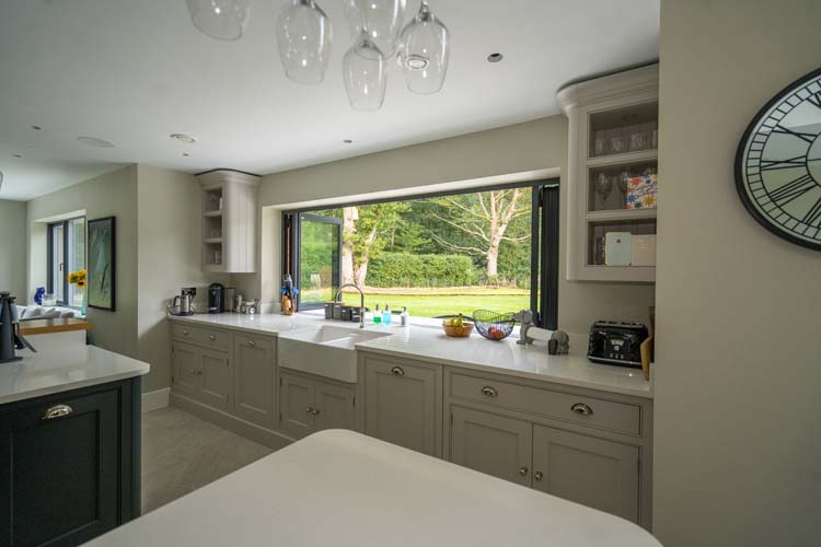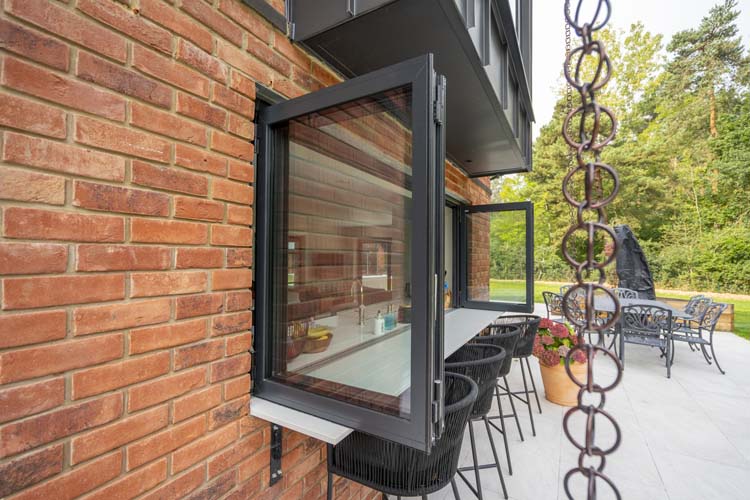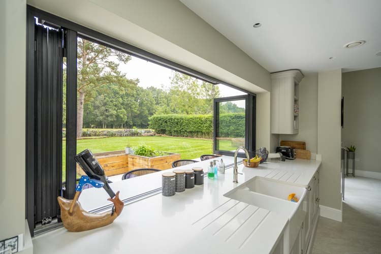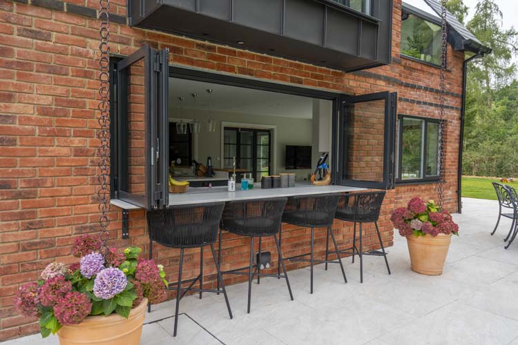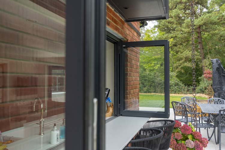 Servery or aluminium bifolding windows offer an eye-catching aesthetic as they fully open and fold neatly to one side, making them ideal for kitchens.