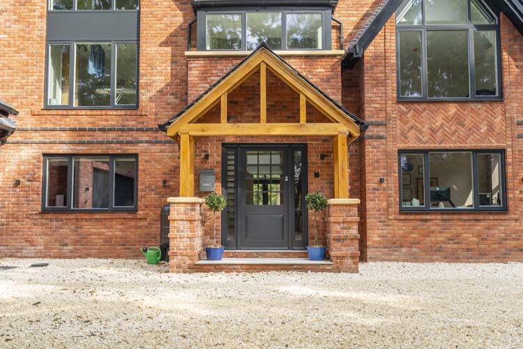 The front elevation combines slim-framed casement windows and two distinctively shaped gable windows. The property’s entrance is through a stunning timber door. The anthracite grey window frames and entrance door give depth and distinction to the red bricks.
