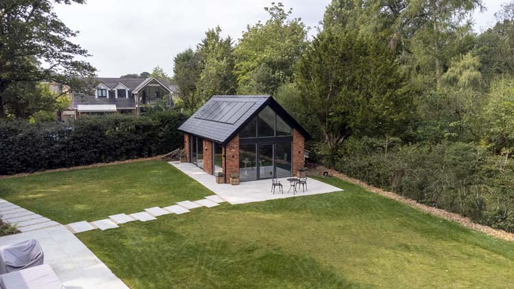 This beautiful timber-framed eco home incorporates an air source heat pump for whole-house heating, an MVHR heat recovery system, and solar panels. The interior features a home automation system that manages lighting, audio-visual equipment, heating, cooling, and security.