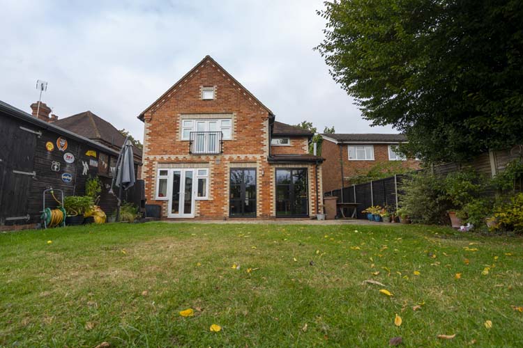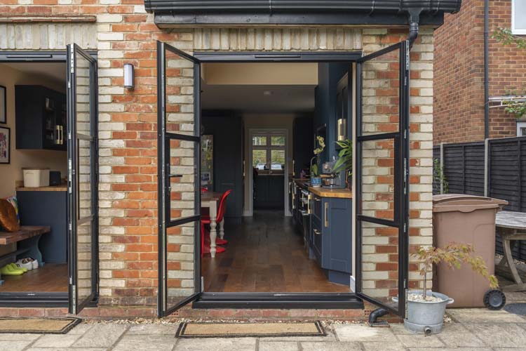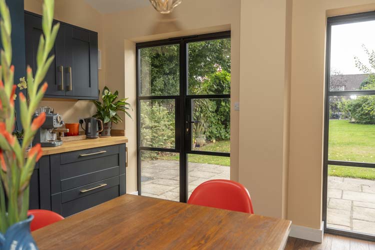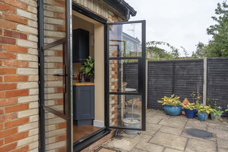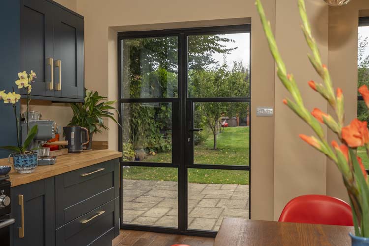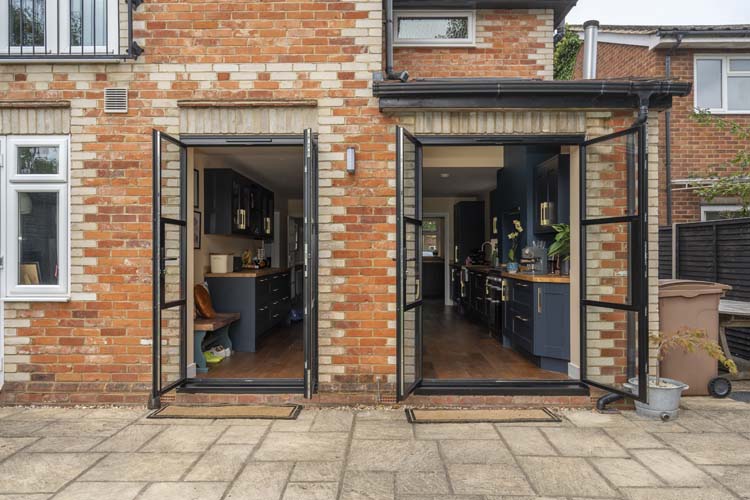The Winnersh homeowners had been planning a kitchen renovation for a few years. They needed more than a simple replacement of white uPVC French doors and a window to their kitchen. They wanted to replace the French doors and kitchen window with two black steel-look aluminium doors from the Art Deco era.