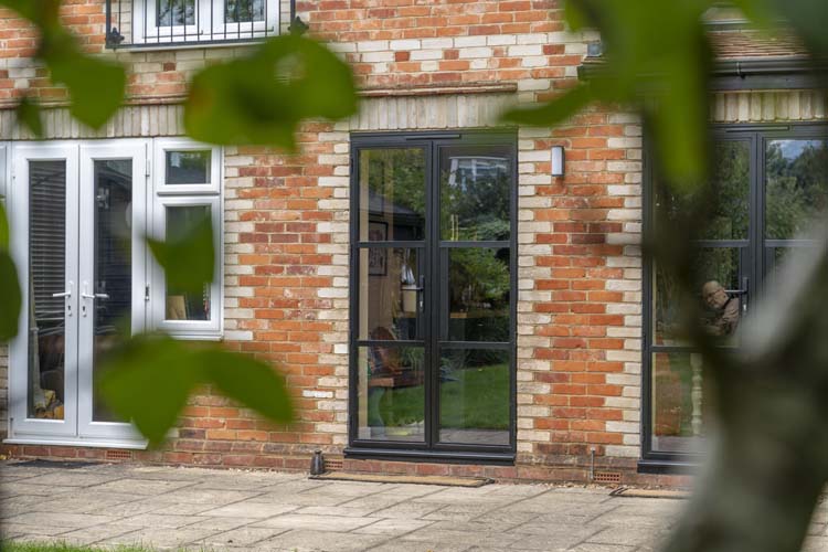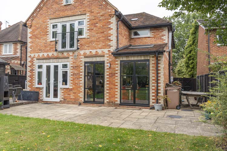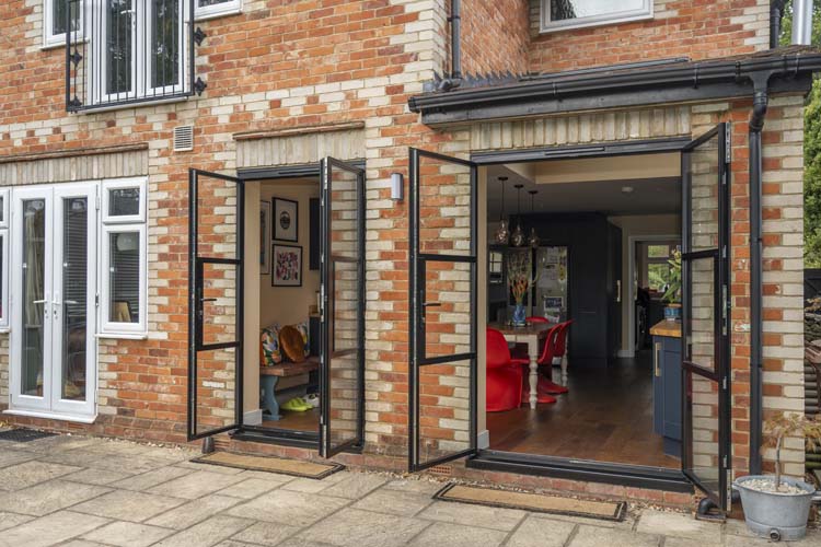 The Winnersh homeowners selected the Heritage French doors, finished in Jet Black RAL9005, for their ultra-slim sightlines, mid-rails, and industrial style.
