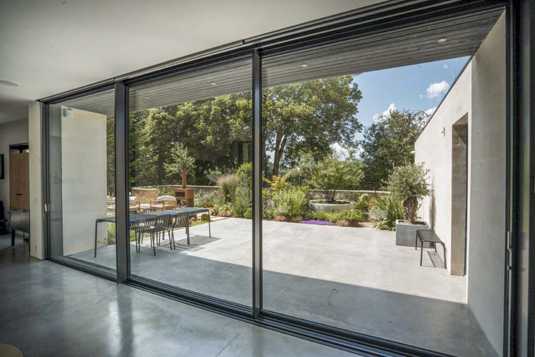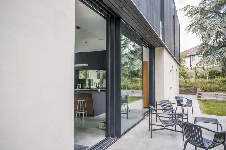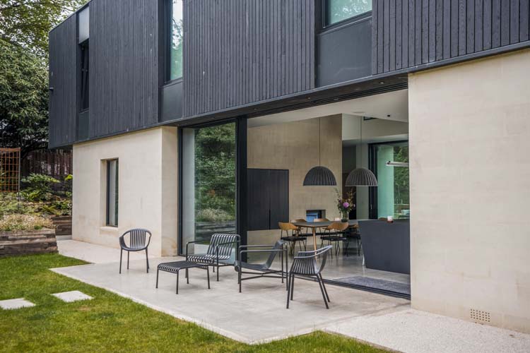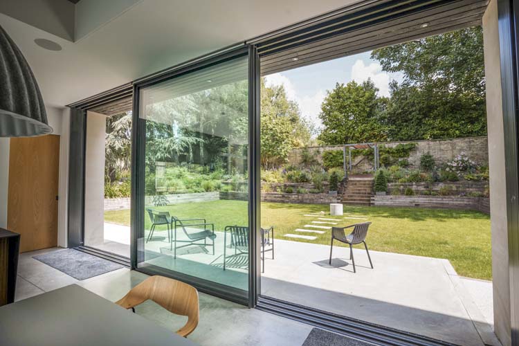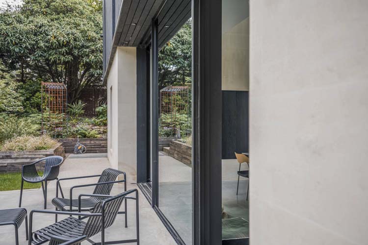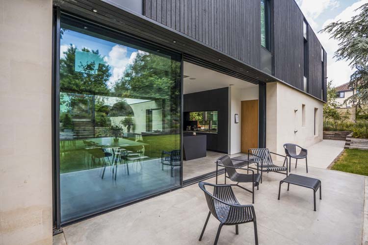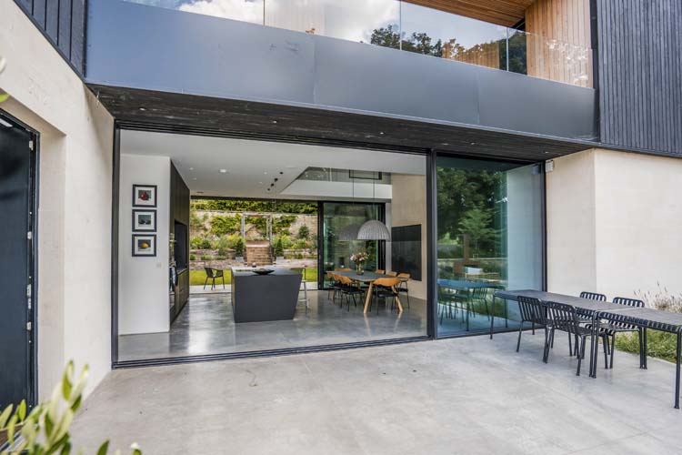 The sliding doors are finished in powder-coated RAL7021, black-grey, chosen by the architect and homeowner to harmonise with the Ashlar Bath stone and dark timber cladding on the exterior.