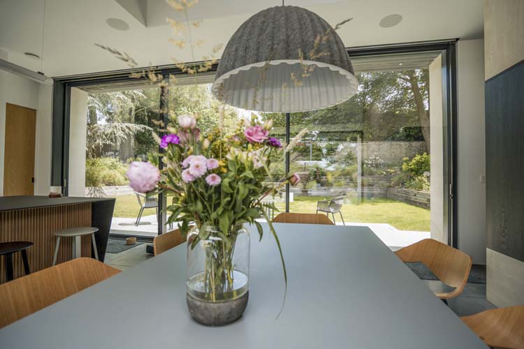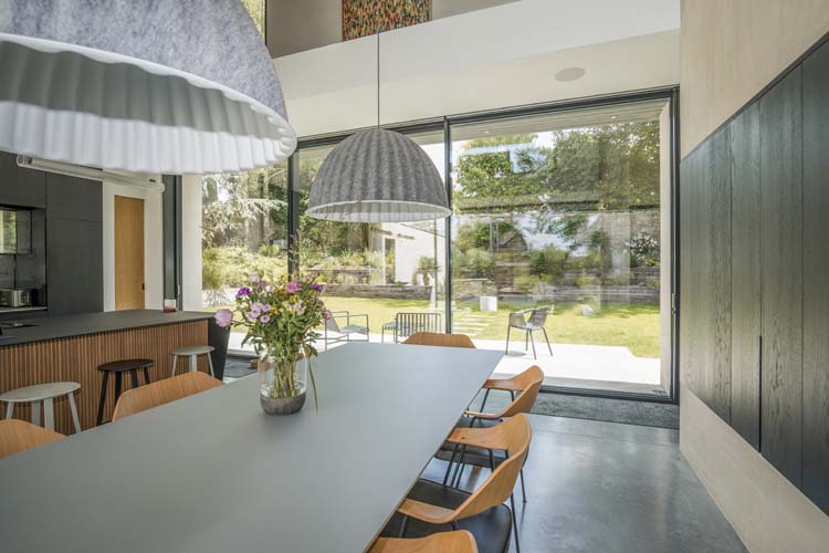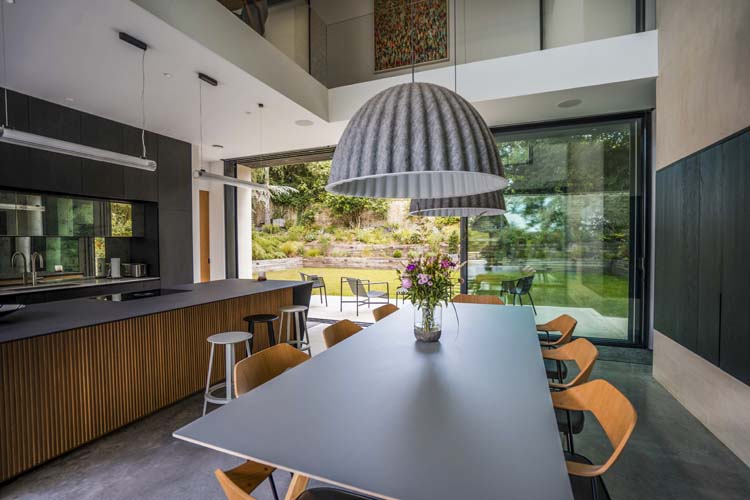 Two sets of oversized, award-winning slim-frame Solarlux Cero III sliding doors make an impressive enhancement to the contemporary kitchen of this stunning new build in the UNESCO World Heritage City of Bath.