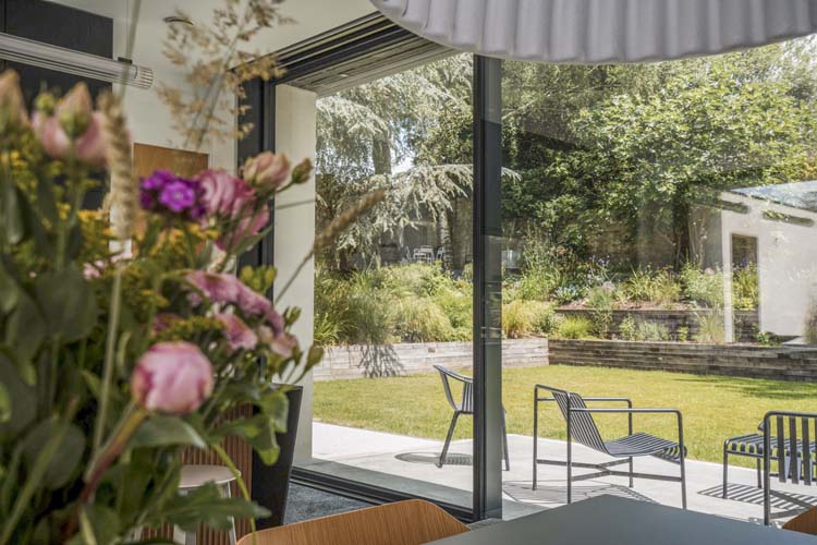 The combination of large floor-to-ceiling glazed units and a 34mm narrow sightline offers 98% glass for a minimal design of the highest quality, strategically positioned to maximise daylight infusion throughout the open-plan kitchen.