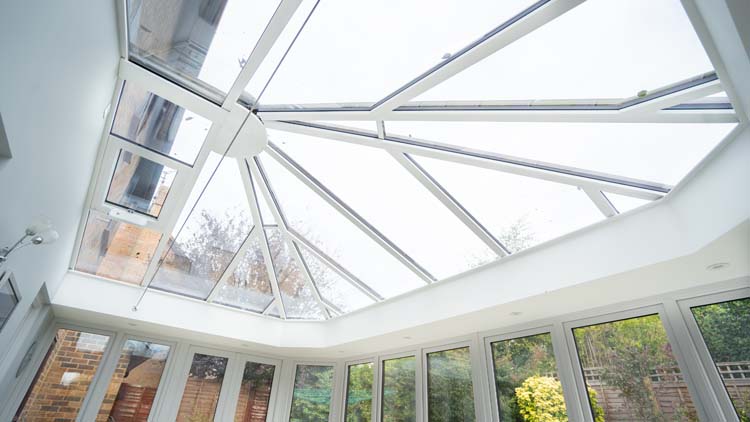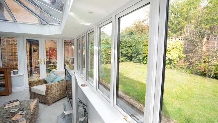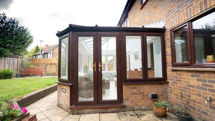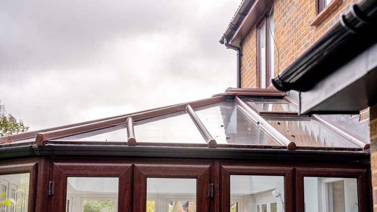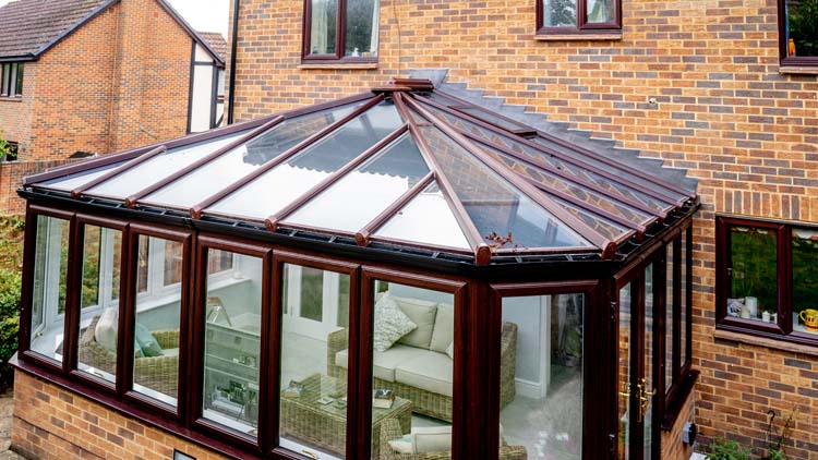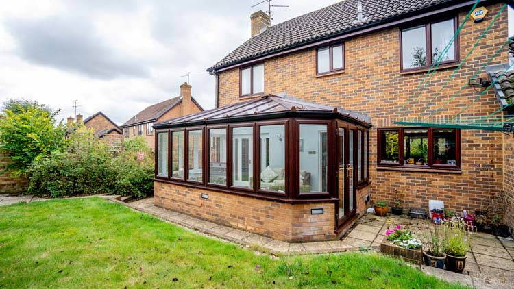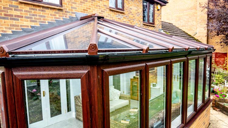 To match their existing windows and doors on the property, our clients chose rosewood with a woodgrain finish for the exterior uPVC frames and white on the interior this helps to make the inside brighter. The Orangery is designed with a combination of double glazed full-length windows with vertical opening and fixed windows with high-security multi-point locks. This selection of window openings allows our clients to open up the windows wide to ventilate their Livin room when necessary and also use an electric roof vent when only a small amount of ventilation is required. The narrower frames allow more natural daylight to permit through the glass to brighten up the interior and naturally warm the living space, making it more energy-efficient.