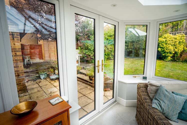 The internal French doors and single door were made to measure for a perfect fit. The interior pelmet features contemporary low voltage downlights to create a homely atmosphere. The furniture accessories include gold handles and hinges, which add a beautiful finishing touch to the whole conservatory refurbishment project.