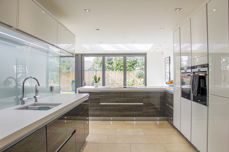 A year later we designed this 45 square meters contemporary Orangery to incorporate cooking, eating and relaxing. The Solarlux SL 60e bi-folding doors with a flush track to the beautiful deck and landscaped garden, and the three roof lanterns, help to give this space the wow factor.