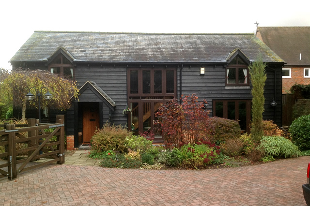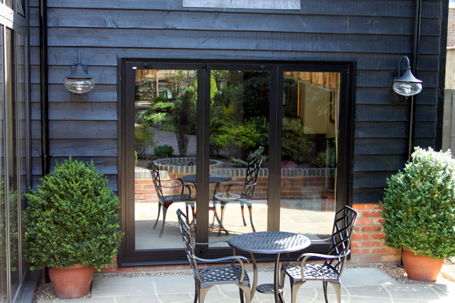 This was done in a stunning metallic grey finish in order to set it off from the dark beams of the barn. The Solarlux SL 60e Bi-Folding doors, installed in place of the existing French Doors to the right, were done in matt black to blend them in and not detract from the feature of the Wintergarden.