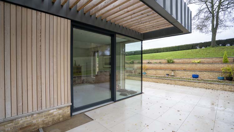 One corner window is designed with Internorm Timber/aluminium HS330 lift and slide door system and fixed window and flush floor threshold to blend the inside seamlessly with the outside of the garden terrace, that allows the Wiltshire homeowners to maximise the evening sunlight to create their own oasis in this countryside location.