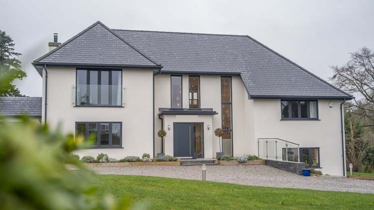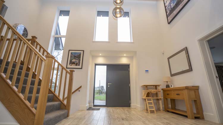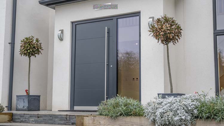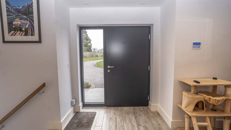 This beautiful contemporary new build features a complete architectural glazing solution with a prestigious Internorm grey aluminium entrance door and sidelight.