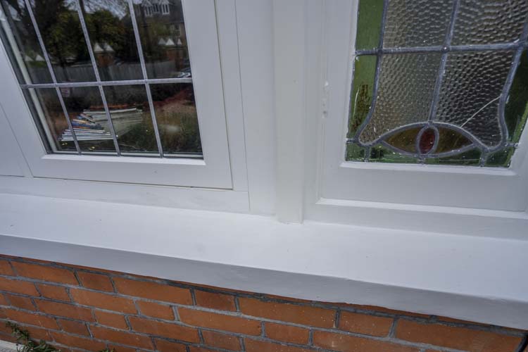 The replacement white square leaded flush casement timber windows are made from factory-finished engineered redwood. The frames are white 9016 on both sides, which is a stark white, not a soft white.