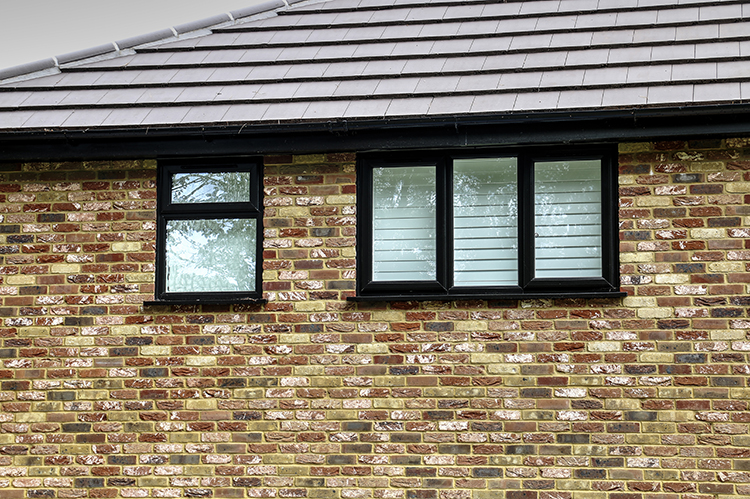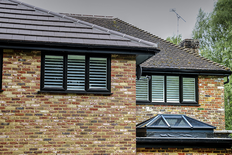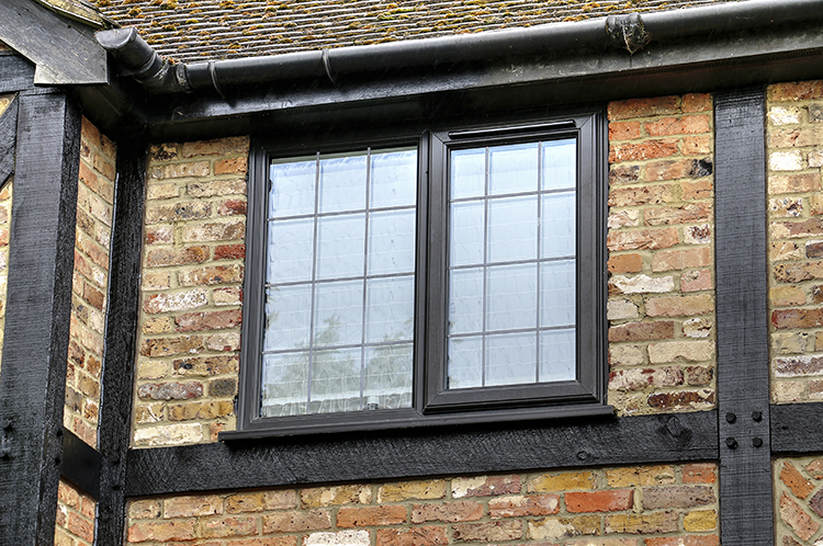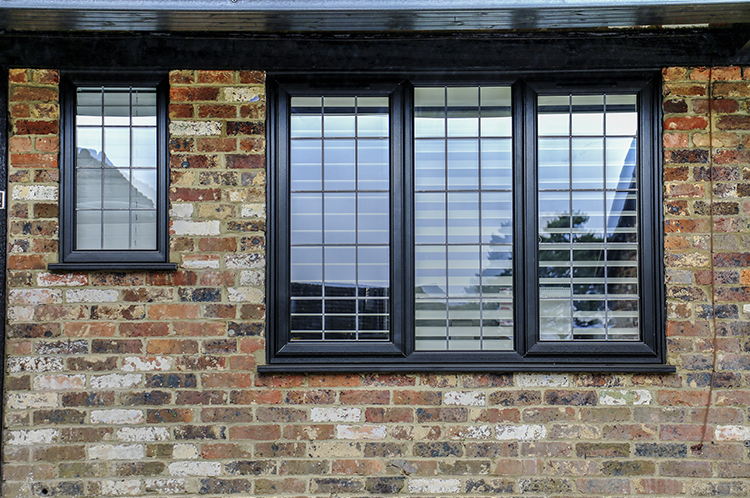 The original Double Glazing in Bagshot home had brown frames with a more traditional diamond lead design in the glass. The replacement double glazing has black frames which better match the mock Tudor beams at the front of the Bagshot property, and a more modern rectangle lead design.
