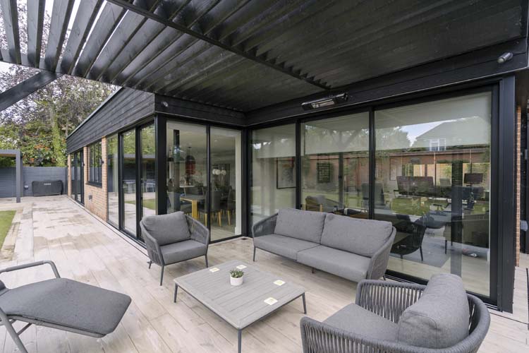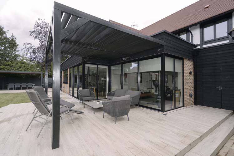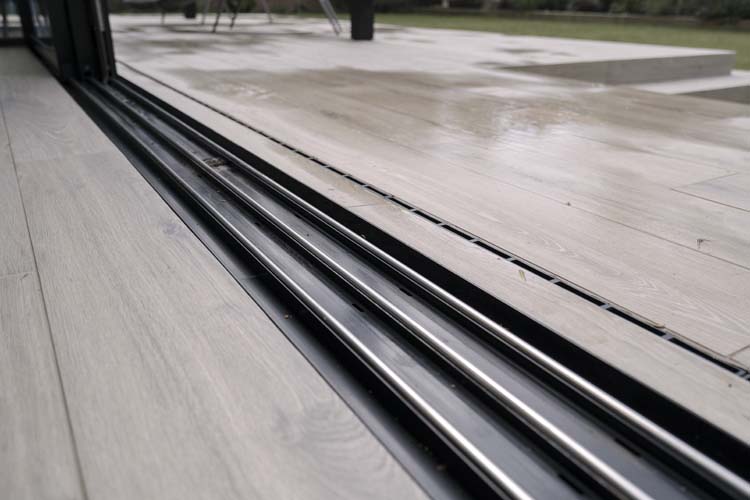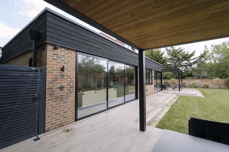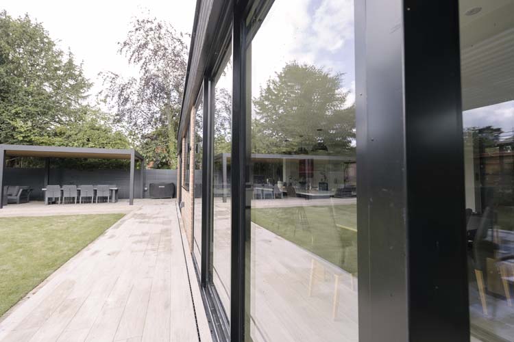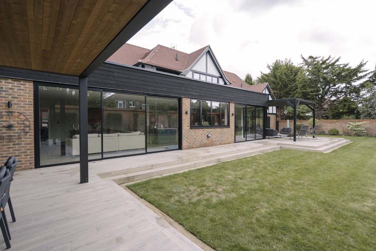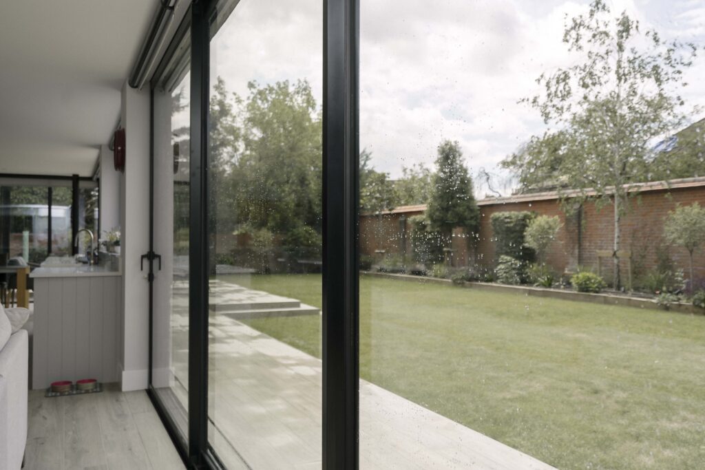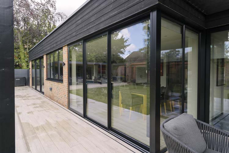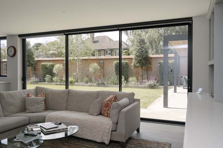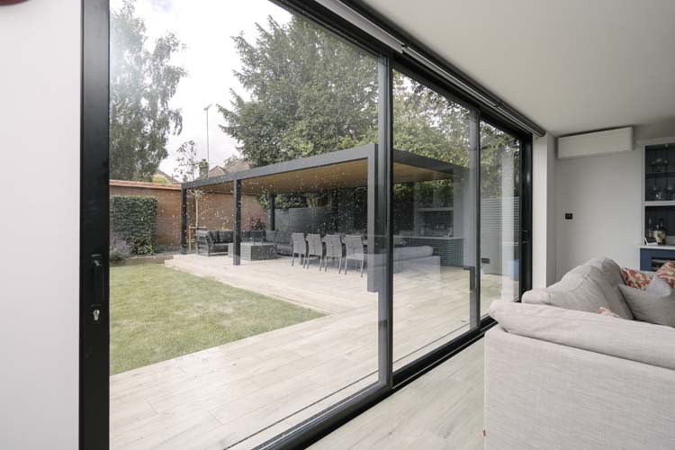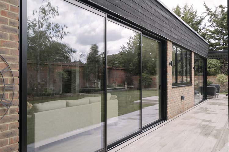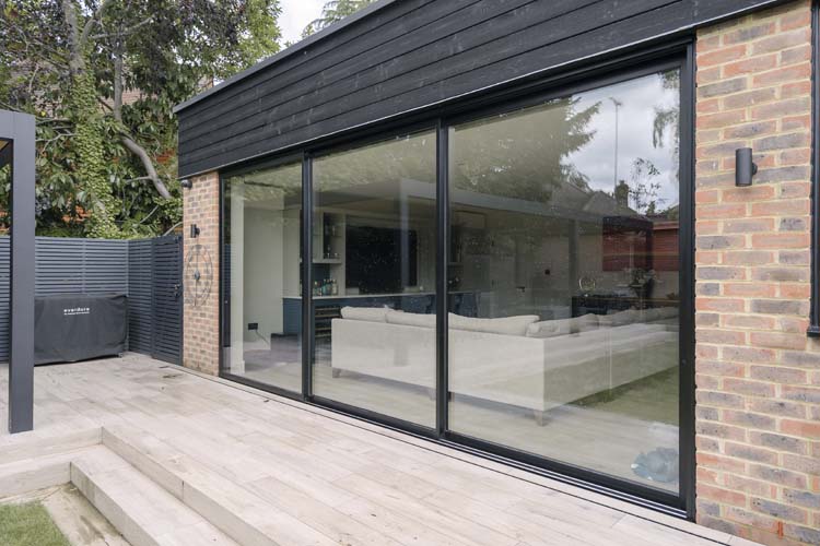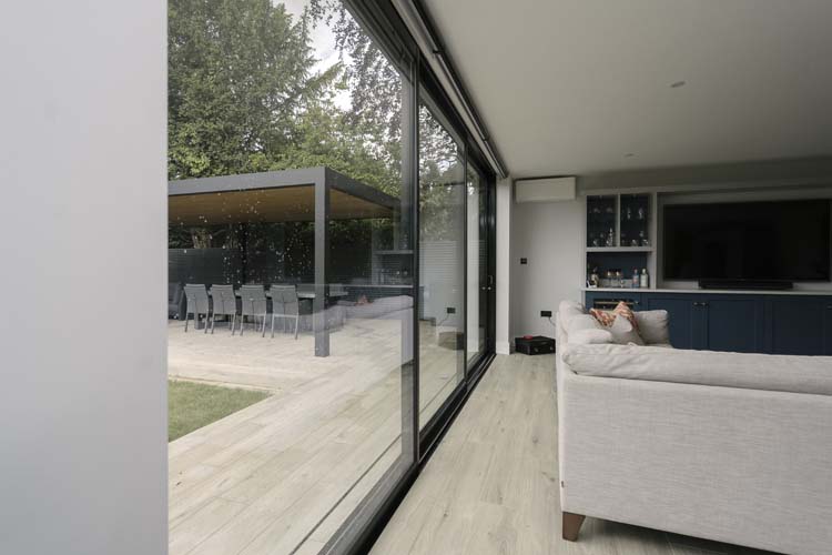 Three sets of floor-to-ceiling glass EdgeGLIDE+® triple-track slim sliding doors span across the rear of the property and have added the wow factor to the new rear extension of this beautiful detached property in Cobham, Surrey.