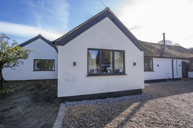 The existing bungalow exterior was covered in a drab off white render, part of the renovation plans was to replace it with a fresh, clean white insulated render once the double-glazed windows and doors had been installed.