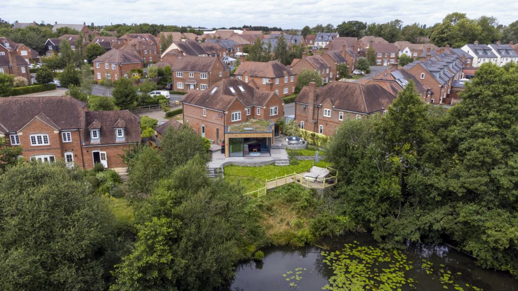The sustainably sourced Canadian western red cedar cladding offers a beautiful colour variation of light reddish-brown to dark brown tones along with traditional brickwork, providing a combination of traditional and modern architecture, and the low maintenance wildflower roof creates an aesthetically appealing finish to the natural modern building design.