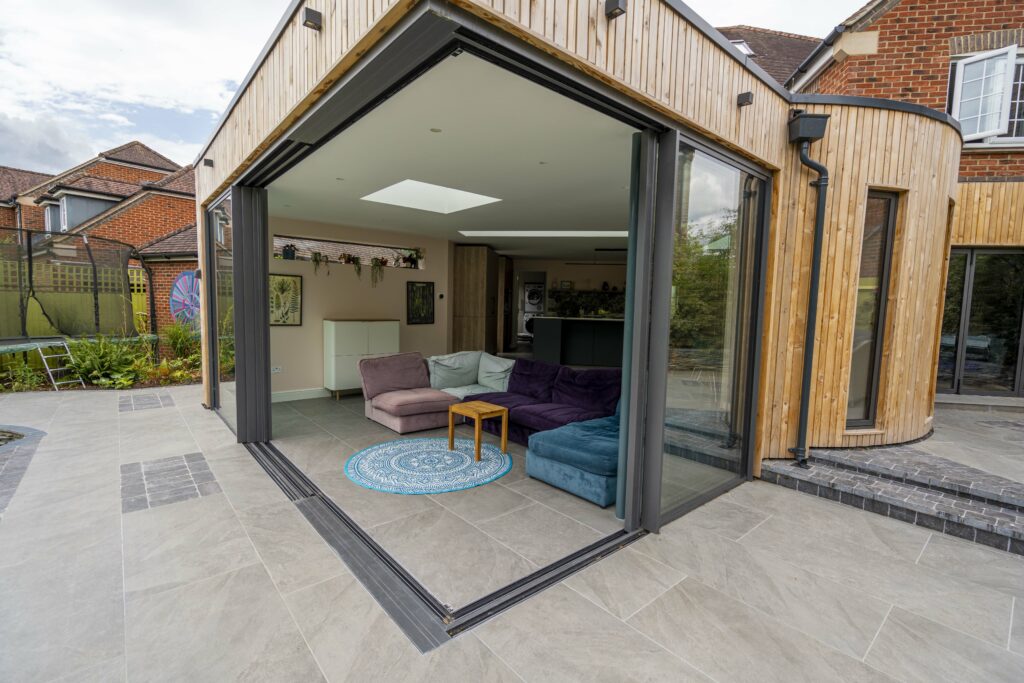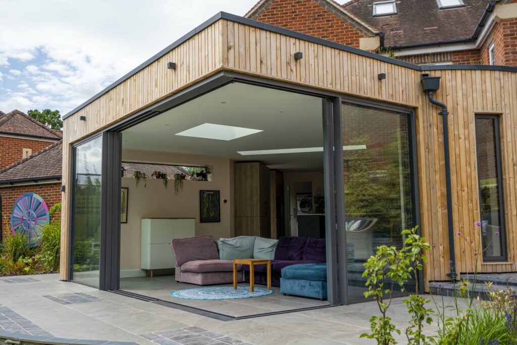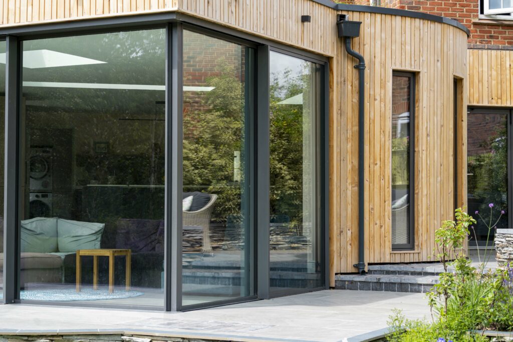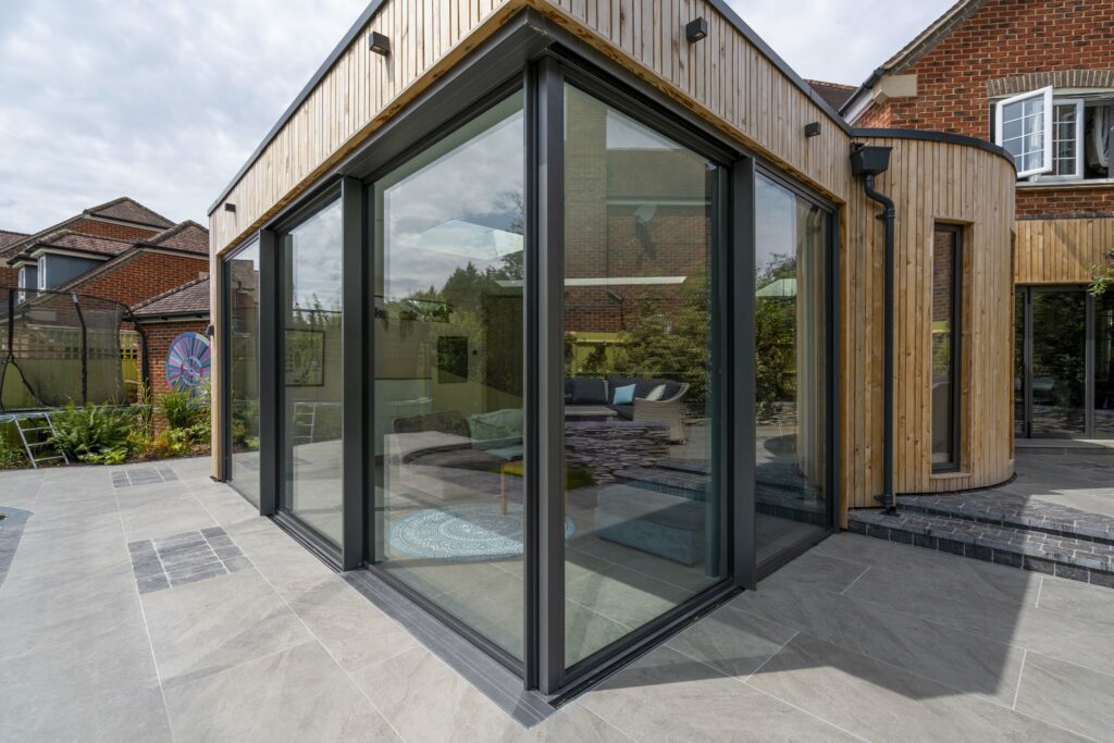 These Cero II frameless sliding patio doors with a moveable corner add the wow factor to this stunning modern cladded single-storey rear extension for a detached property in Thatcham.