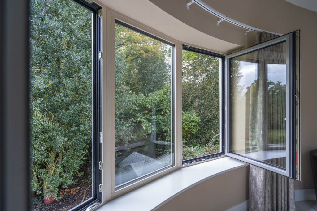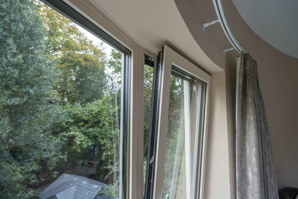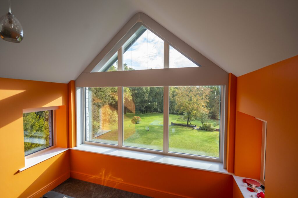 To ensure a contemporary design, the Wokingham homeowners opted for a combination of tilt & turn and fixed windows. This also included a large glazed entrance atrium and a shaped gable on the rear elevation. The dual-function handle mechanism allows a turn function to open the window inward and a tilt ventilation at the top.