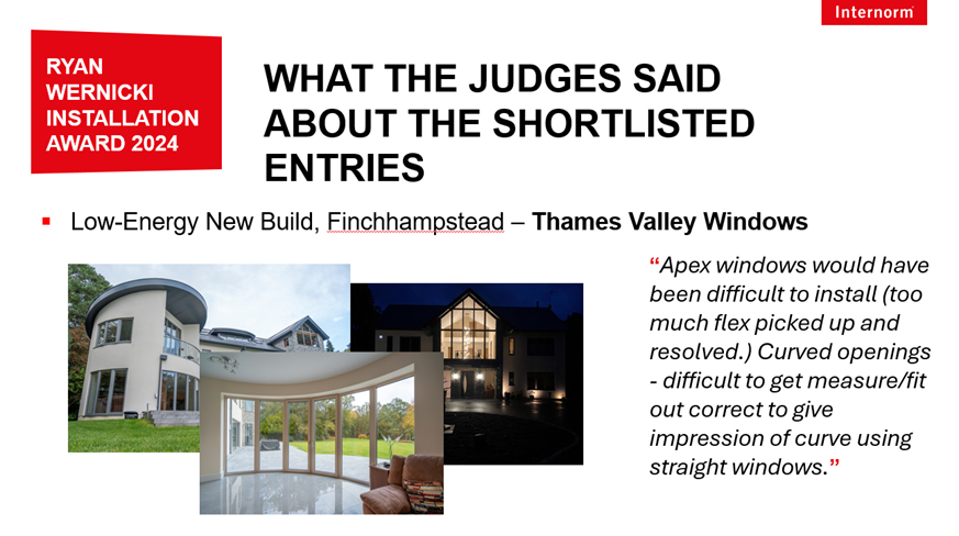 We are delighted to announce that this new-build project in Finchampstead was shortlisted for the Internorm Ryan Wernicki Installation Award 2024 which includes a nice quote from one of the judges, Gipi Sagoo from G-Tec