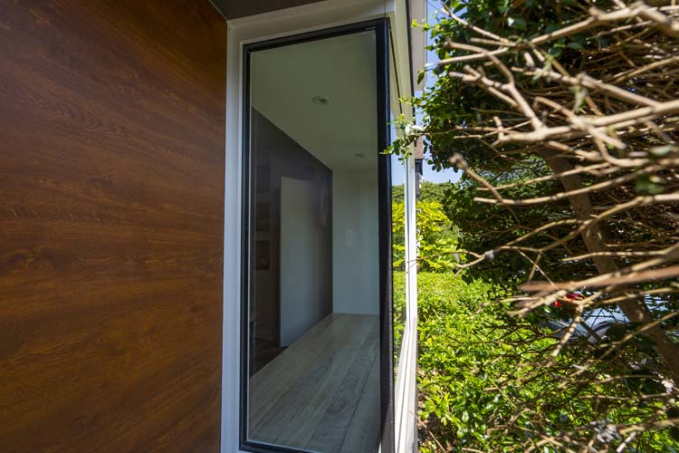 To achieve the glass-to-glass effect, two fixed HF410 Internorm Timber/aluminium studio windows are bonded together with silicone to create a comprehensive, flush, and seamless finish.