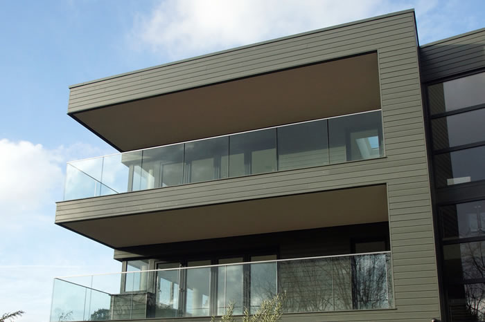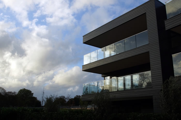 The exterior of the two residential buildings merge a striking clad fascia with large expanses of glazing. Each apartment benefits from a spacious balcony with a sleek glass balustrade to provide residents with access to outside space and beautiful views over the common.