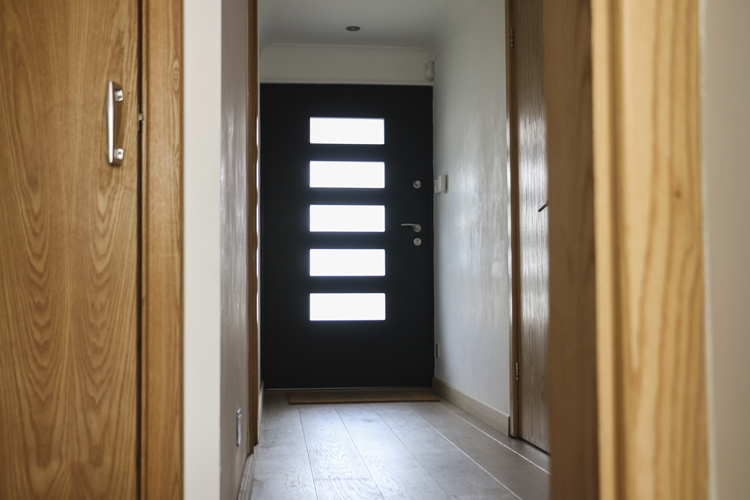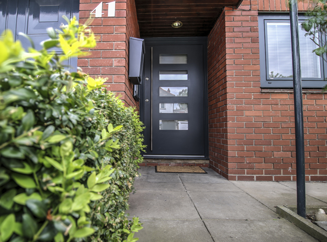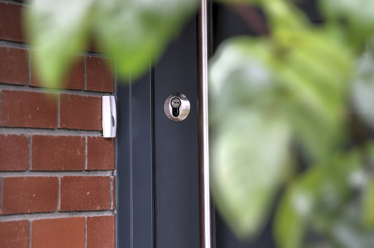 The contemporary front door is finished in anthracite grey on both sides and features an 1800mm stainless steel bar handle.