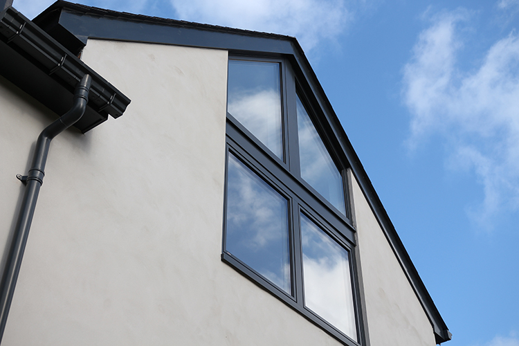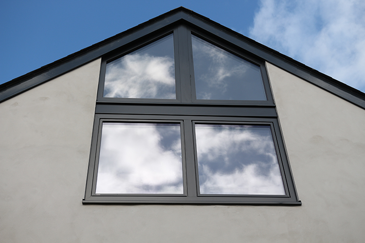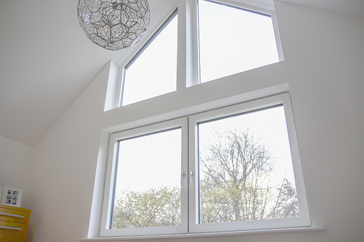 The HF310 timber/aluminium tilt and turn windows from Internorm are tripe glazed as standard and are finished with a white painted interior and anthracite grey outside. These windows have superb thermal and acoustic benefits, achieving u-values as low as 0.69 W/m²K, making them suitable for passive house projects, and a superb sound insulation of 35dB.