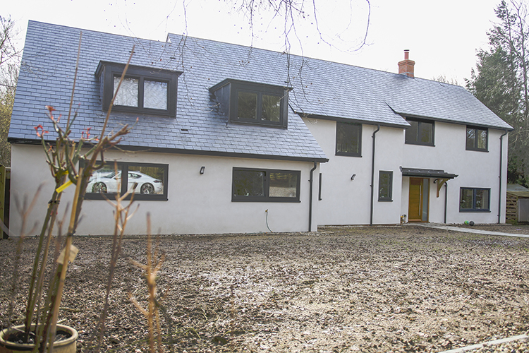 The original property on this site in Newbury has been completely renovated and re-modelled. The original roof was removed and replaced with new slate tiles. The window and door openings have been re-worked to create larger glazed areas and all elevations have been rendered to completely reinvent this house in to an imposing, contemporary home with major wow-factor!