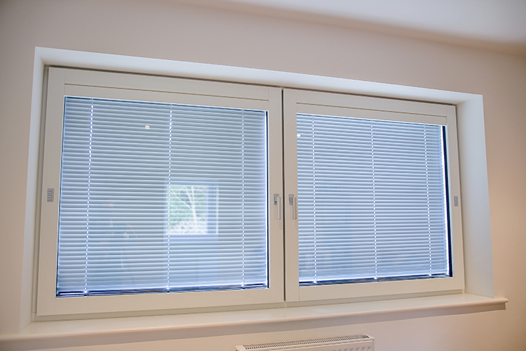 Integrated blinds were chosen for the bathrooms and en-suite. These are solar powered with a battery for backup. They can be controlled manually or by remote control. Access to the blinds is quick and easy, should any maintenance be required.