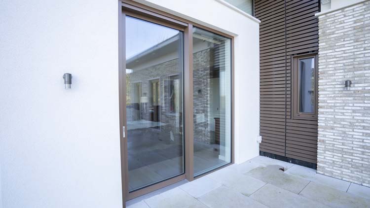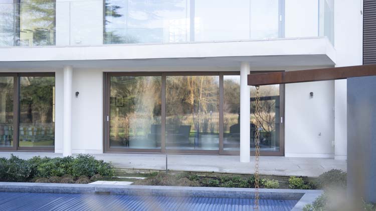 The lift and slide doors and window frames were designed with a dual finish, deep brown walnut premium timber option on the inside and a special RAL matt colour, M8025 pale brown on the exterior. The homeowners chose this stunning walnut finish on the inside to match the feel of the reception areas. However, rather than use painted wood in the downstairs basement area and bedrooms, we cleverly utilised the timber look PVC option on the inside finish in these areas, which saved the homeowners a significant amount of money. However, from the outside, there is no difference in the look of the product.