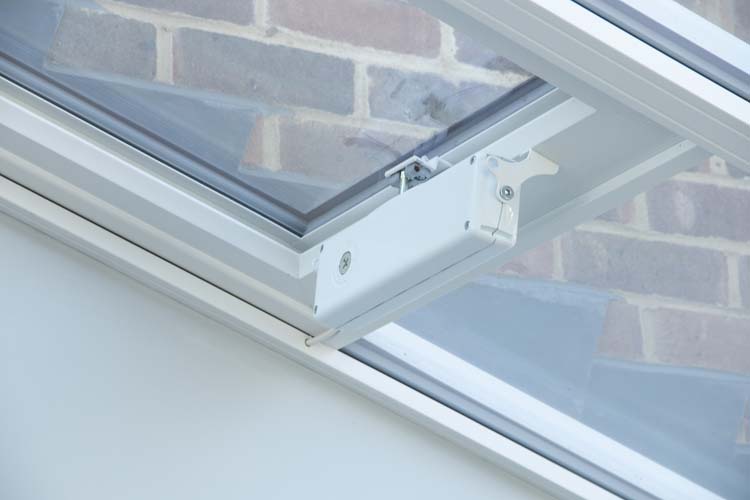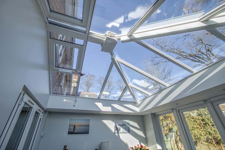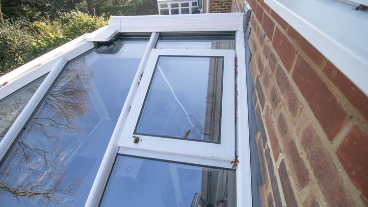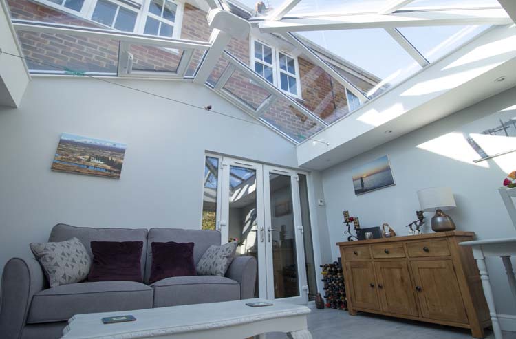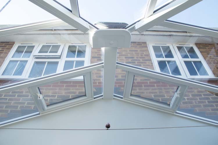 The glass roof with electric vents is toughened self-cleaning glass, perfect for roofs where the rain simply washes any dirt away. The double glazed windows and French Doors are Antique Rustique in smooth white uPVC with flush casement. They are finished with satin lever handles and hardwood cills on the exterior. The roof lantern is finished in white to match the window and door frames.
