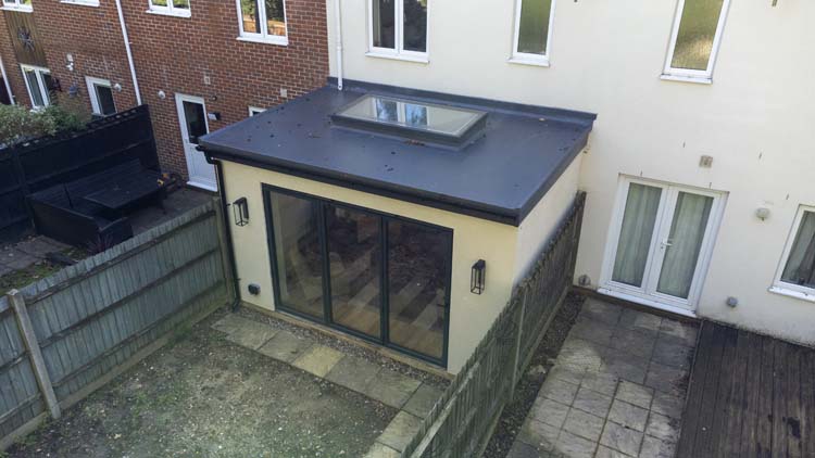 Paul recommended the double-glazed Luminia F82 Plus bi-fold door system from AluK as it is a cost-effective minimalistic door system with an ultra-slim 97mm sightline and a low u-value of 1.2 W/m²K. For the flat roof, he recommended Atlas flat rooflight, a contemporary architectural aluminium flat roof system.