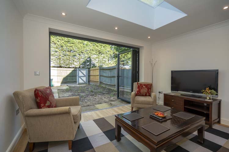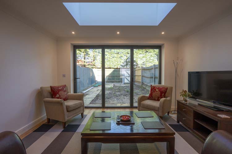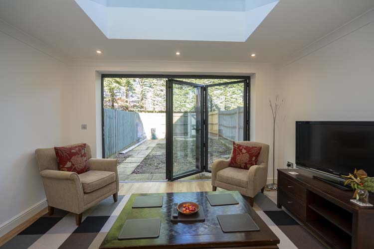 The homeowner briefed the architect on their new rear extension, a minimalistic rooflight or lantern and aluminium bi-folding doors opening to the garden, creating a light and open living space.