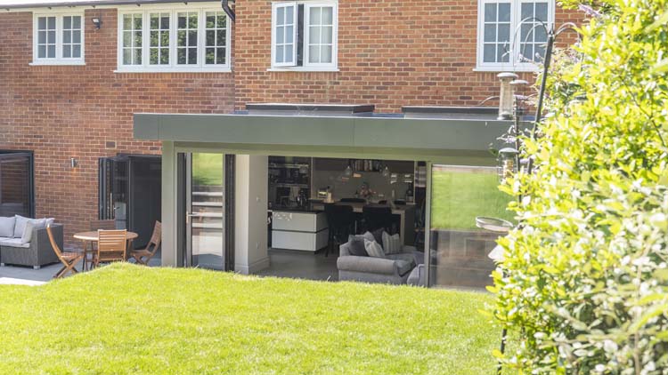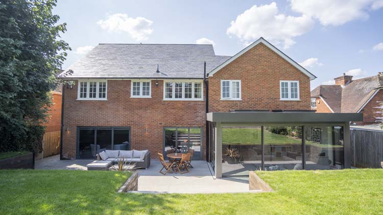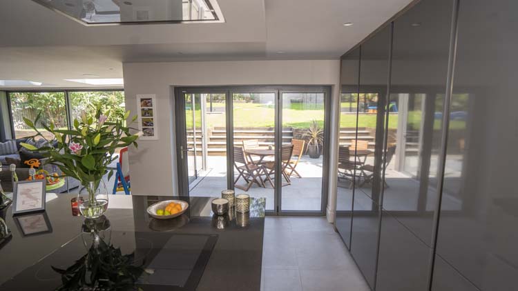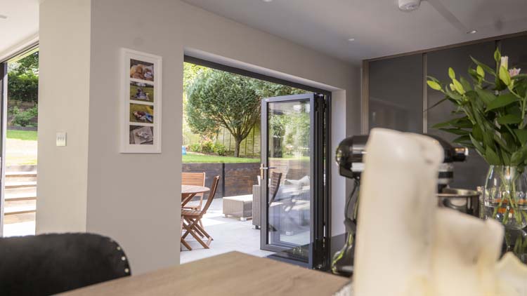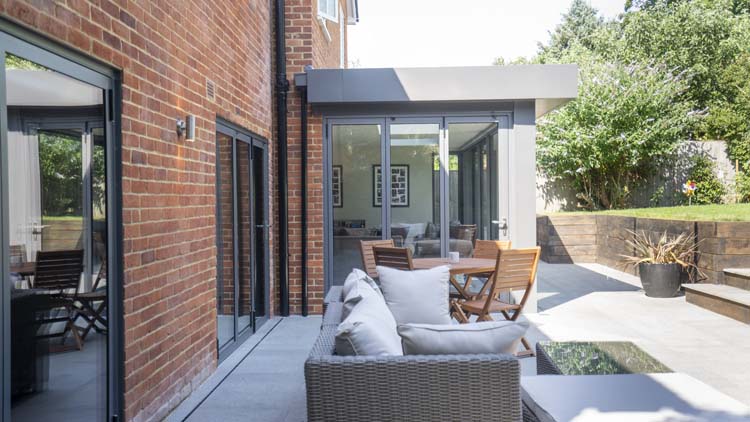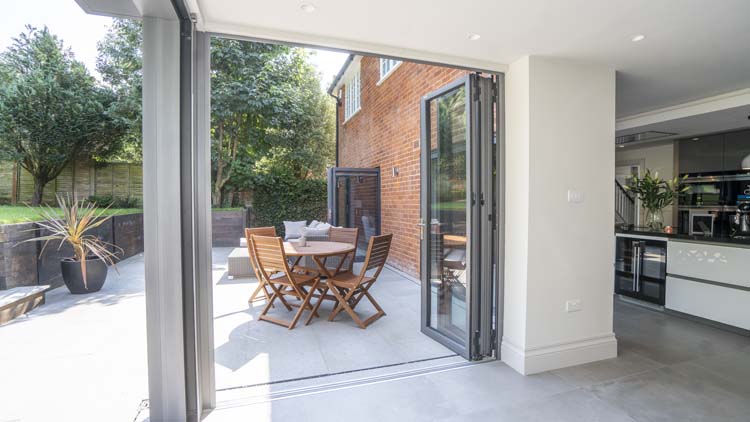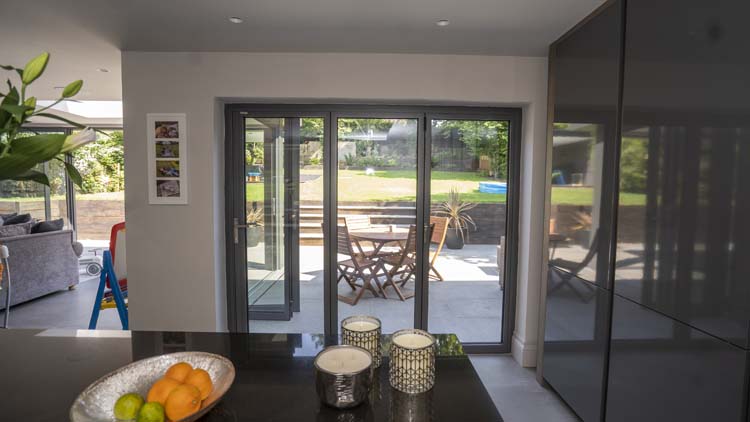 The Bourne end property boasts another two sets of bi-folding doors at the rear of the property to the kitchen and living room. The low maintenance aluminium is finished in the stylish powder coated dark grey DB703 both inside and outside.