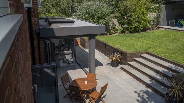 The homeowners chose Solarlux bi-folding and slimline sliding doors and two Atlas frameless flat roof lights for the modern orangery extension for their minimalist detailing, outstanding performance, exceptional energy efficiency and maximum light.