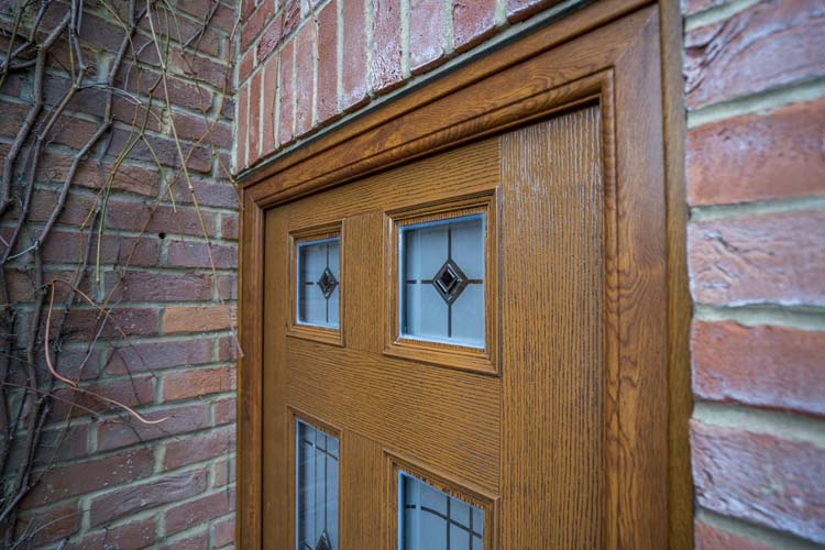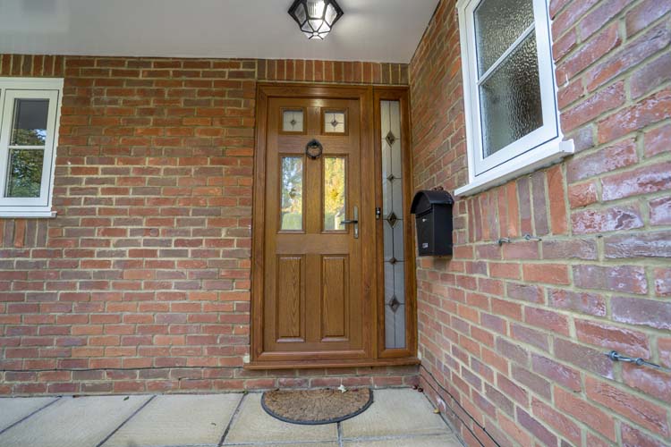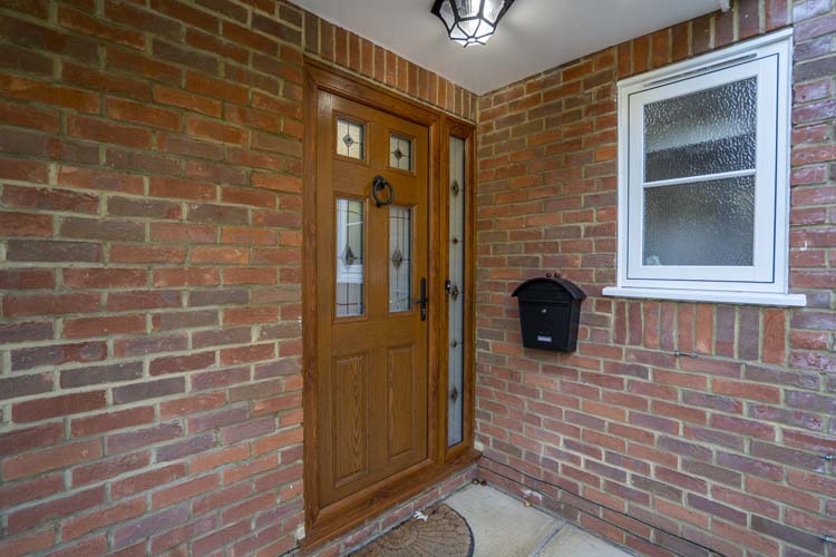 This stunning, high-performance oak front door and frame with leaded glass side panel from Apeer traditional composite door range has enhanced the entrance to this beautiful detached property in Goring.