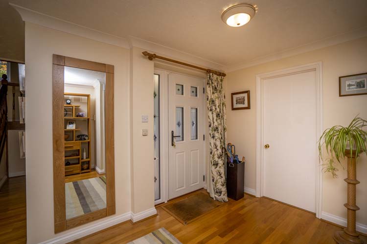The leaded glazed panels within the doors allow natural light to flow into the home and through the hallway.