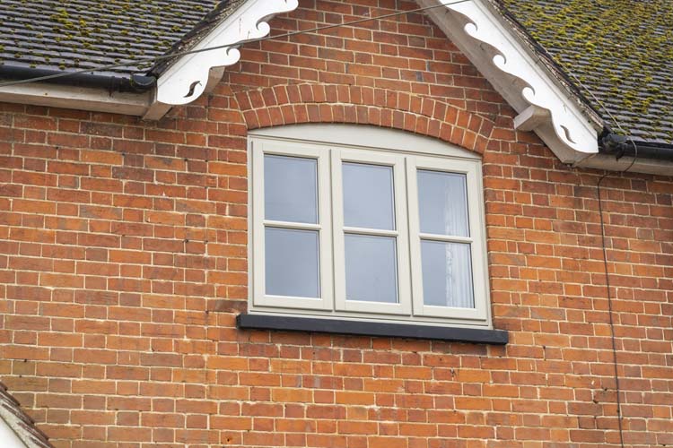 The olive grey window frames perfectly complement the beautiful brick arch above the windows and the orange brickwork, creating a soft, balanced contrast. Inside, the white finish brightens the living spaces and enhances the natural light, a subtle detail that makes a striking difference.