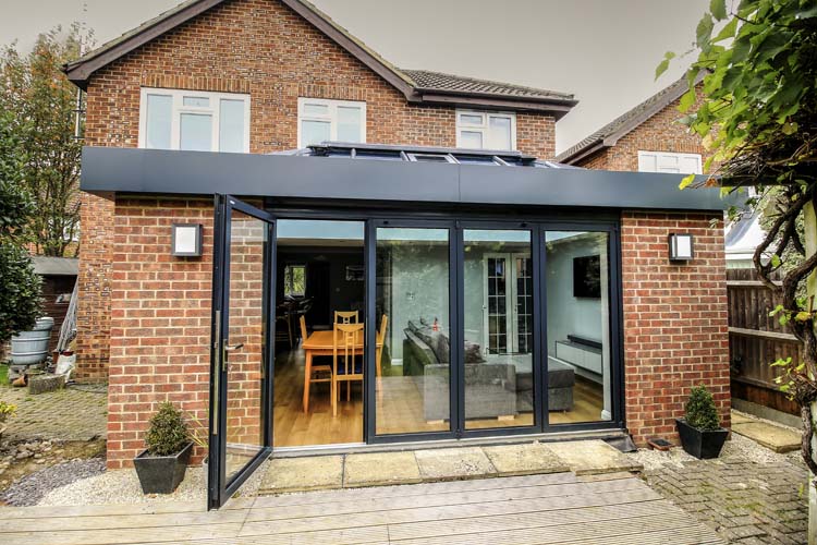 The Orangery extension is designed with a combination of solid walls in half bond brickwork and white double glazed uPVC windows, four-panel Solarlux SL60E aluminium bi-folding door finished in RAL7016 Anthracite grey. The walls were built using matching bricks as the property, and the new uPVC white windows were also the same window style to ensure the Orangery extension blends seamlessly to the existing property.
