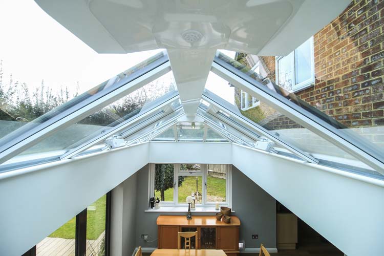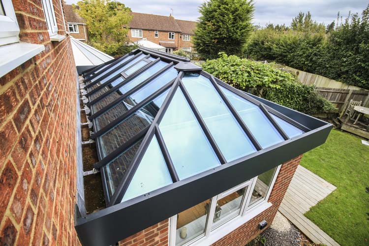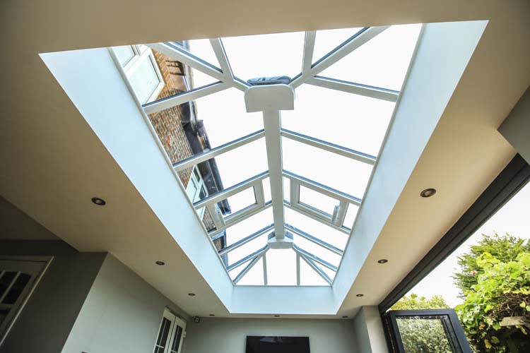 The focal point is the Ultraframe roof lantern that is glazed in modern self-cleaning solar control glass that is thermally efficient. This specialist glass coating ensures a controlled temperature all year round and moderates the glare of the sun in summer months. The roof lantern is finished with matching RAL7016 on the exterior and white in the inside with a contemporary cornice finish.